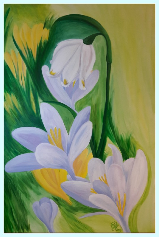 Noch zaubert der Winter mit seinen Eigenschaften die Landschaft in seinen Ansichten. Im Ateliergarten blicken schon die ersten Frühblüher durch und versuchen sich sanft zu zeigen. Das Frühjahrsgrün fehlt noch etwas, aber die ersten Sonnenstrahlen locken das Wachstum ins Frühjahr. Dadurch entstand in Acrylfarbe dieses große Bild von 80x120cm Größe. Herzliche Grüße an meine Artistfriends