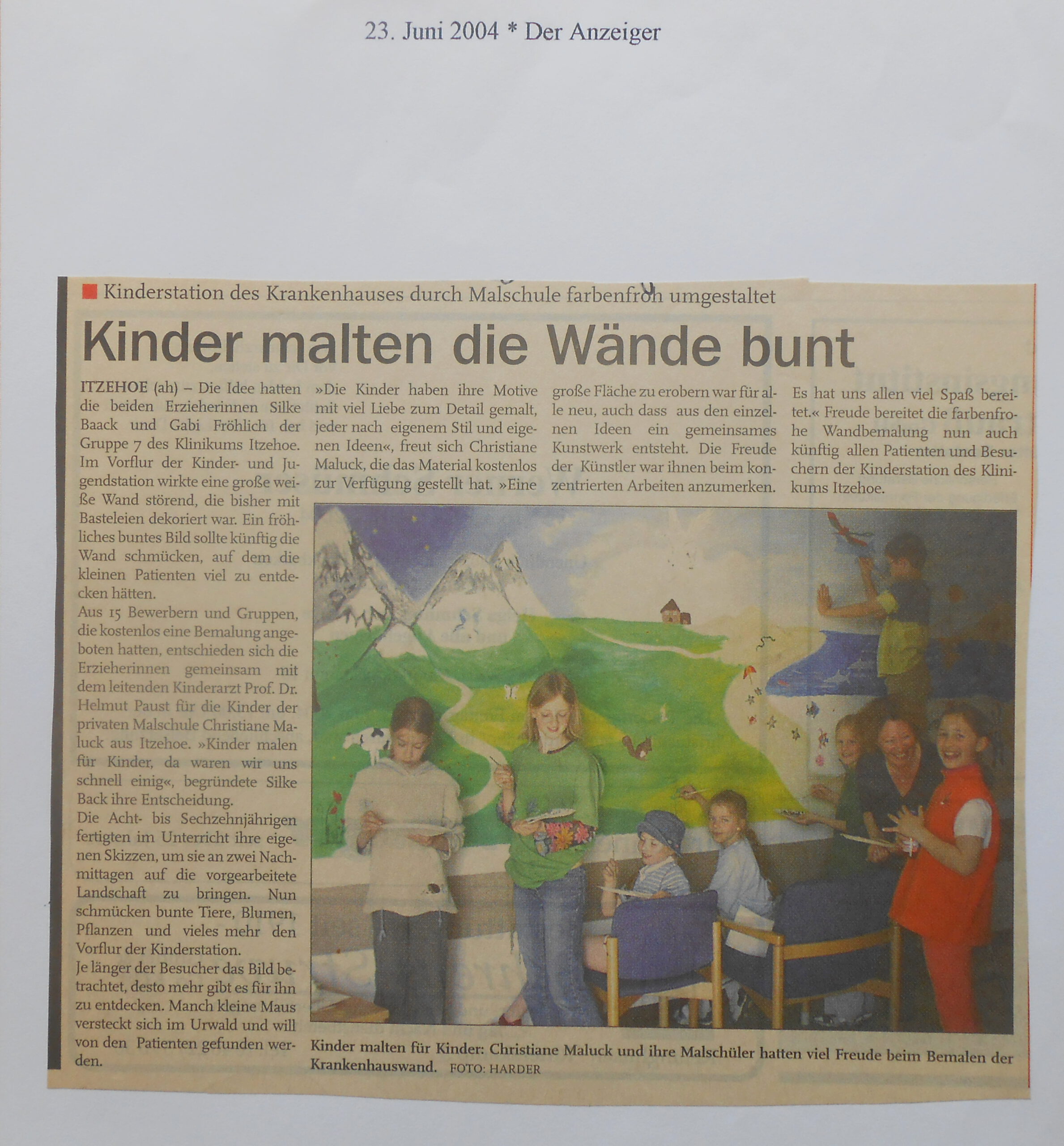 Schöne Erinnerungen gibt es von meiner kleinen Malschule. Zum Beispiel, dass wir mit allen Malgruppen die Wände der Kinderstation in 2004 im Klinikum Itzehoe gestaltet haben.